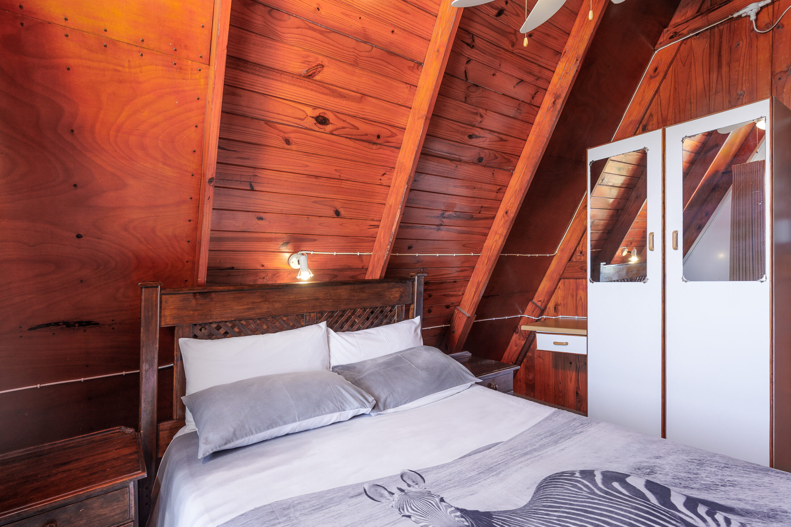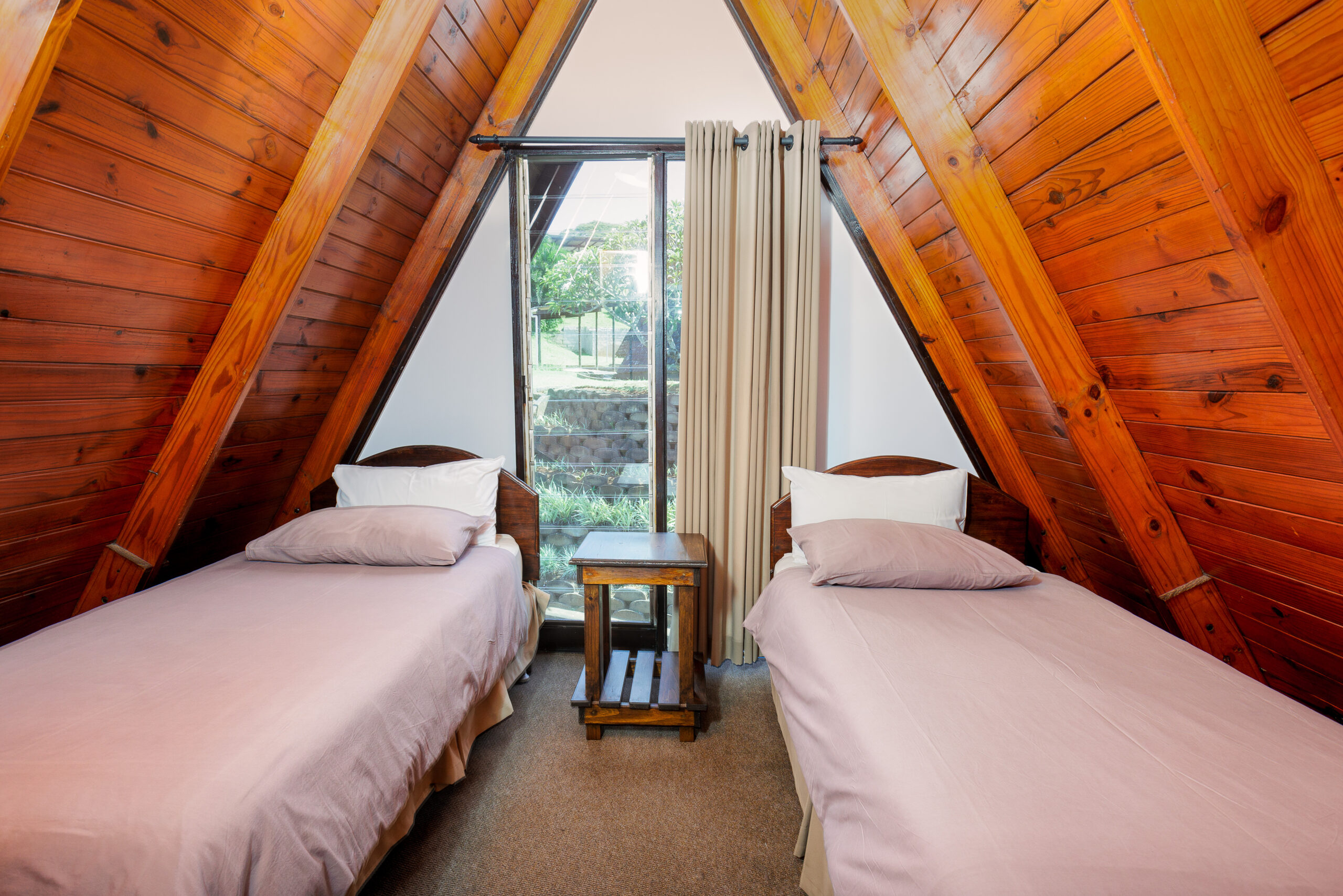 The double-storey, self-catering and heart-warming Chalets are tastefully furnished, each with a private patio, the kitchen has been fitted with modern appliances such as a family fridge, stove, oven, microwave, toaster, kettle, crockery and cutlery enough for six guests. Each A-Frame Chalet has two bedrooms upstairs; with a double bed in the master bedroom and two single beds/ a double bed in the second bedroom as well as the downstairs bedroom. The bathroom has a bath/shower, toilet, and hand basin. The luxurious newly built chalets are designed in an ultra-modern style with three bathrooms and three bedrooms. Ceiling fans are installed for those hot summer days and extra blankets (on request) in winter.